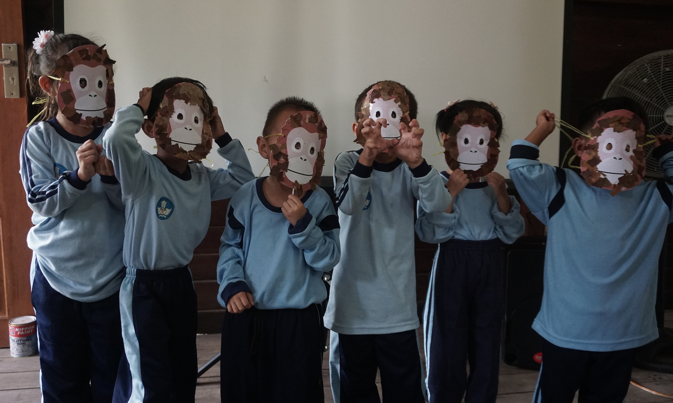 Considering the children’s young age, the session was designed to be light and engaging, interspersed with a fun activity: decorating orangutan masks using dried leaves. With great enthusiasm, the children glued pieces of dried leaves onto masks prepared with double-sided tape, guided by SOC staff and their teachers. This activity not only enhanced their fine motor skills but also provided a creative way to help them recognize orangutan characteristics in a simple and memorable manner.